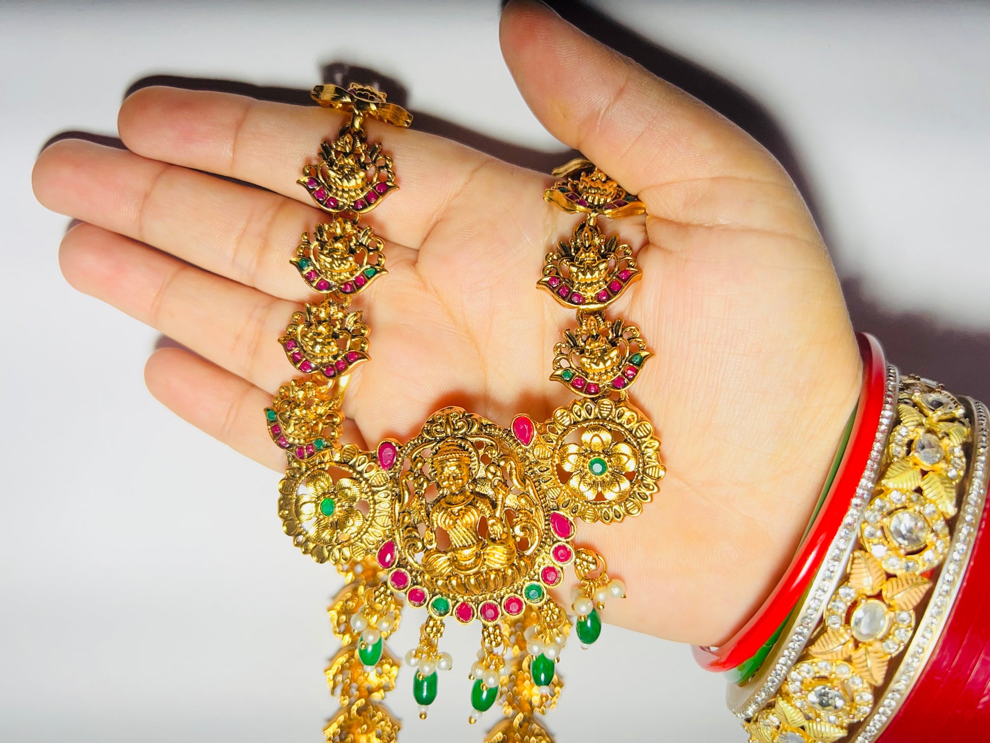 Celebrate tradition and elegance with this exquisite temple jewelry necklace set, featuring a beautifully crafted Goddess Lakshmi pendant. The necklace is adorned with intricate floral motifs, red and green stones, and delicate pearl and bead drops that highlight its divine charm.