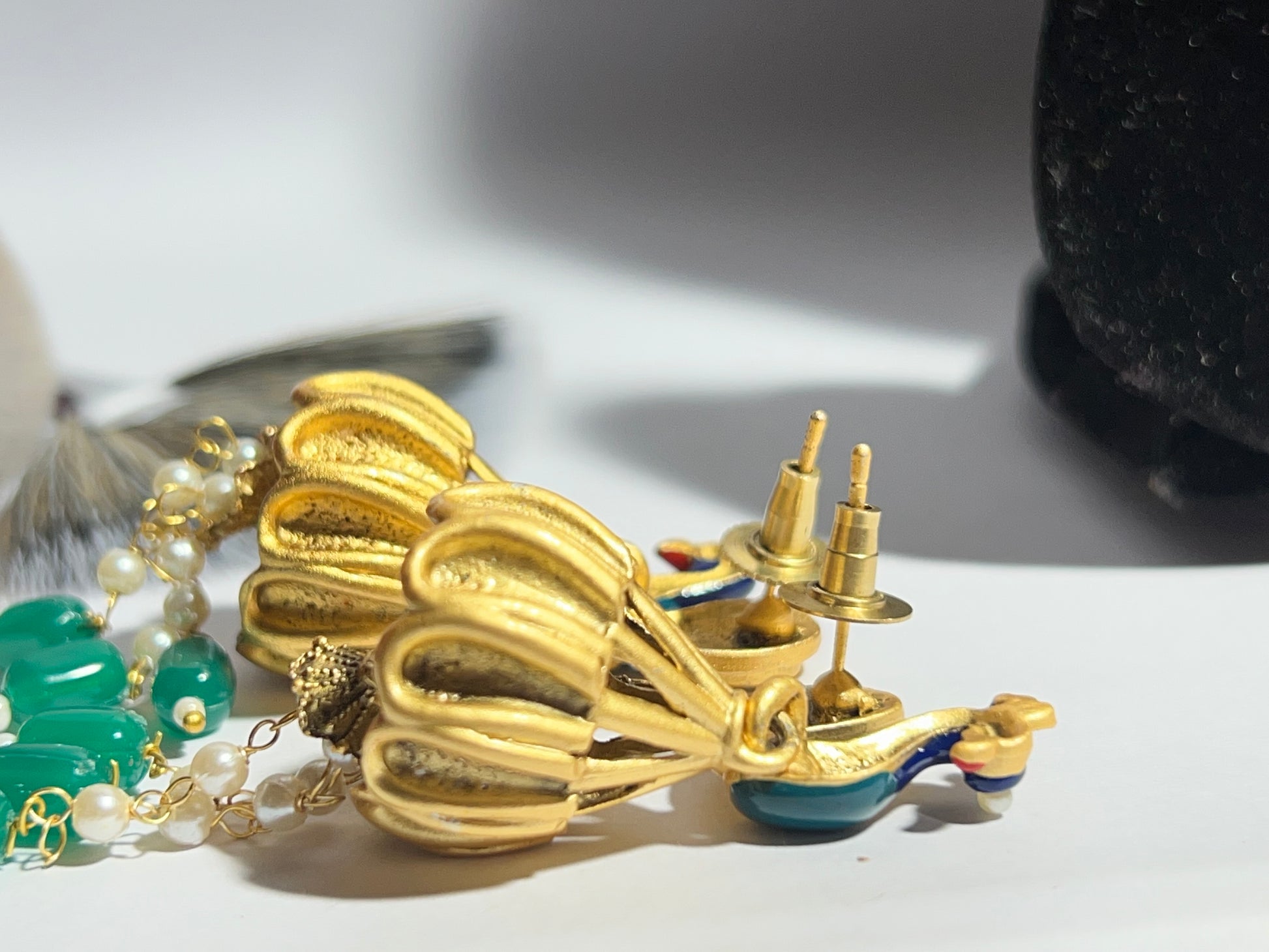 Make a royal statement with this exquisite necklace set, featuring multiple strands of delicate white and golden beads beautifully accented with intricate peacock motifs. The centerpiece showcases a graceful enamel peacock design with cascading golden tassels, adorned with pearls and green bead drops for a touch of sophistication.